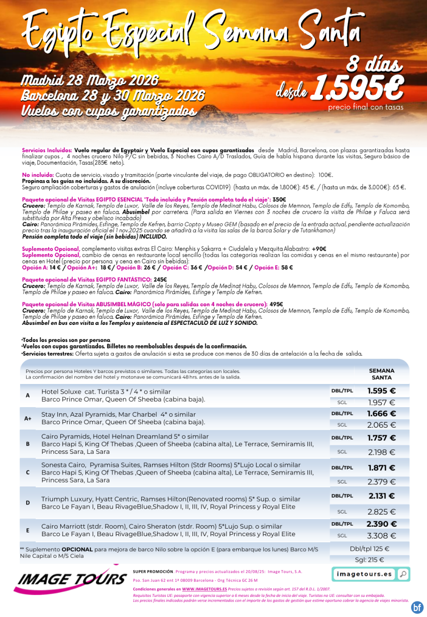Egipto Charter Semana Santa 2026, con cupos y precios desde 1.595€